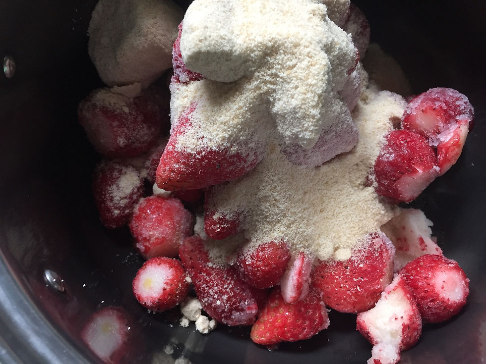 イチゴジャムにもいろいろな作り方があると思います。皆さんはどんな風に作りますか?●材料冷凍イチゴ 500g砂糖 100g (今回はきび砂糖)レモン汁 小さじ一杯●作り方冷凍イチゴを鍋に入れ、砂糖をかけて半日くらい置くかき混ぜながら強火で15分アクを取りながら煮詰める出来上がりタッパーに入れたら300gすごく甘い